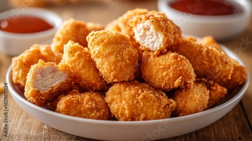 Crispy golden chicken nuggets in a bowl with ketchup.