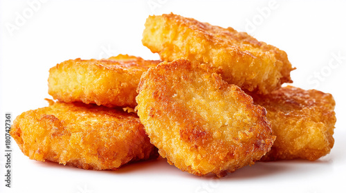 Crispy golden chicken nuggets piled on a white background