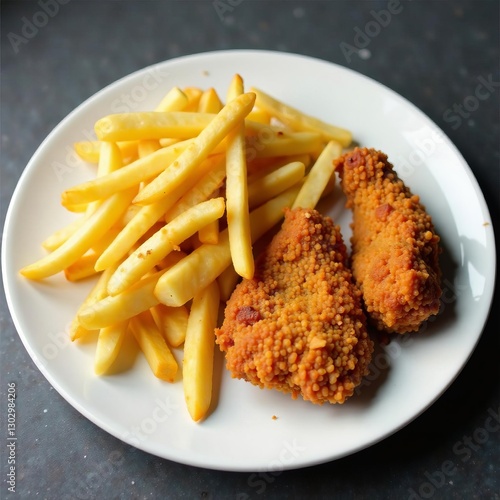 Crispy golden chicken strips and seasoned french fries on a white plate, delicious, meal