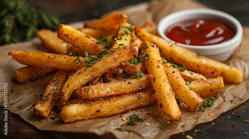 Crispy Golden French Fries with Herbs and Spices, Served with Ketchup on Parchment Paper.