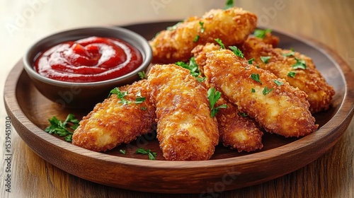 Crispy golden fried chicken tenders garnished with fresh parsley served on a wooden plate with a bowl of rich red dipping sauce