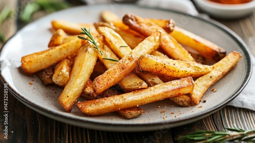 Crispy Golden Fries Served on a Stylish Plate with Rosemary Garnish