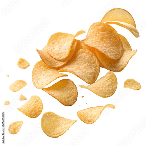 Crispy Golden Potato Chips Flying in Air