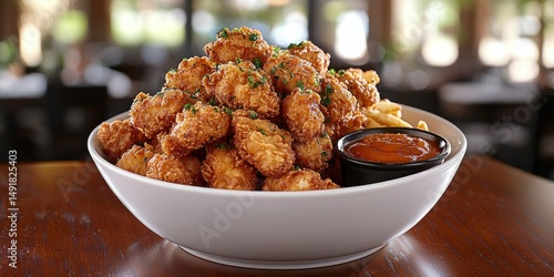 Crispy, golden-brown bites piled high in a bowl, with fries and dipping sauce