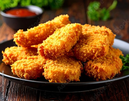 Crispy golden-brown breaded chicken pieces piled high on a dark plate. A bowl of red sauce is visible in the background
