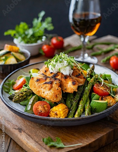 Crispy, golden-roasted chicken pairs with smoky grilled zucchini, bell peppers, and asparagus. A fresh salad with goat cheese and balsamic vinaigrette completes this rustic, vibrant, and savory meal.