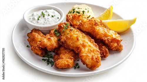 Crispy homemade fish sticks on a white plate, isolated on a clean white background with a side of lemon wedges and tartar sauce