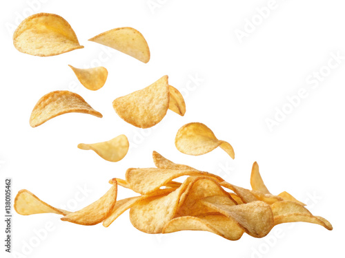 Crispy potato chips are flying in air, creating playful and dynamic scene that captures essence of snacking joy