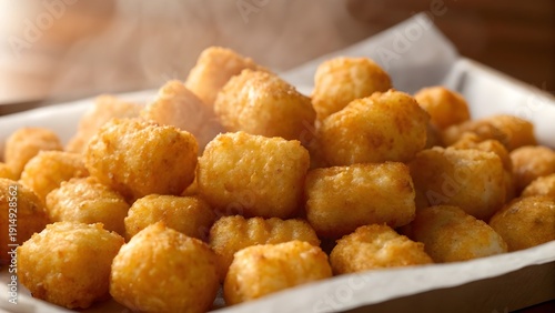 Crispy Tater Tots Captured In Warm Close‑Up Showing Golden Crunchy Potato Exterior, Highlighting Textured Surface, Savory Warmth, And Irresistible Comfort Food Appeal