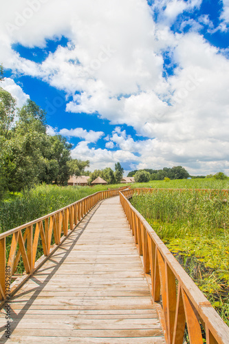 Croatia, Baranja, Kopacki Rit nature park wooden boardwalk view, beautiful countryside landscape, cloudy day