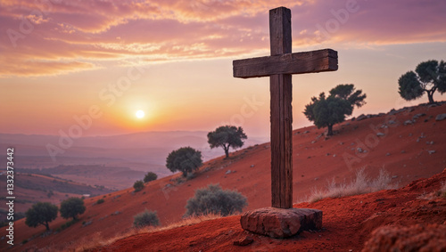 Croce cristiana su una collina della Terra Santa illuminata dalla luce del sole al tramonto