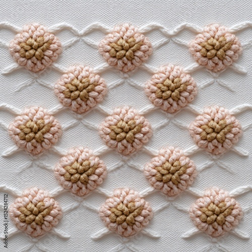 Crocheting handmade minimalist concept. Textured fabric design featuring floral motifs in a soft, muted color palette.