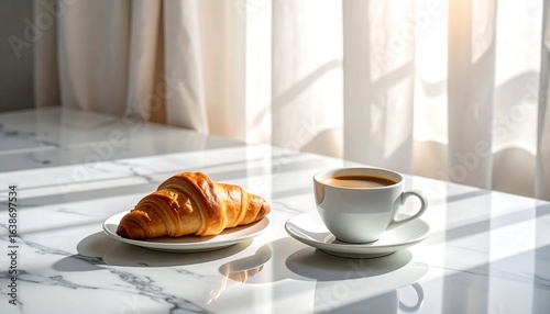 croissant, eating, plate, hot drink, drink, cup, saucer, sitting, table, marble, window, sunlight, morning, breakfast, indoor, day, shadow, refreshing, still life, white, food, fresh, baked, pastry, delicious, lifestyle, leisure, relaxing, beverage, nourishment, eating habits, refreshment, tabletop, sunny, daylight
