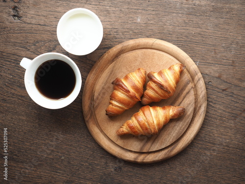 croissant and coffee set on wooden plate