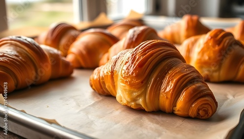 Croissants are placed on a baking sheet lined with parchment paper, the crust is golden brown.