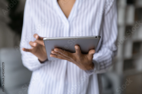 Crop close up of mixed race female hold modern tablet work online on device at home. African American woman use pad gadget browse surf wireless internet web. Technology, electronics concept.