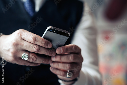 businessman, text messaging, smartphone, cyberspace, online, work, ring, masculine, expensive, using, contraption, man, device, mobile phone, chatting, creative, design, surfing, accessory, browsing, modern, style, classic, mobile phone, male, intelligent, occupation, job, tied-up, formal, entrepreneur, independent, professional, self employed, executive, daytime, crop, unrecognizable, anonymous, faceless, blurred background