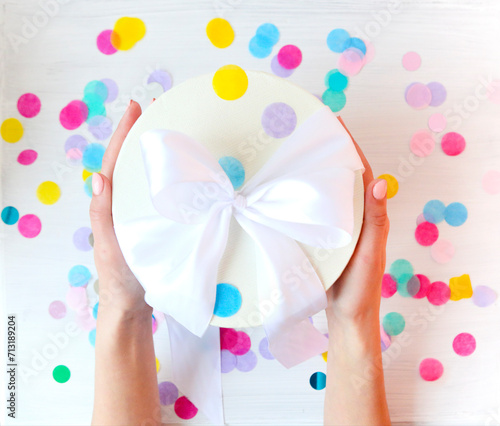 woman, present, birthday, confetti, celebration, table, carry, colourful, box, surprise, female, wrapped, container, package, bow, ribbon, event, festive, weekend, party, lady, holiday, fun, joy, traditional, round, gift, many-coloured, decor, design, hand, body part, horizontal, from above, topview, overhead, crop, faceless, unrecognizable, anonymous, young, happy, girl, holding, valentine, romantic, romance, celebrate, white