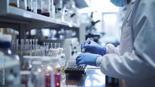 Cropped close-up of scientist's hands in rubber protective gloves and a row of test tubes in scientific chemical laboratory. Development and production of innovative vaccines to treat pandemics.