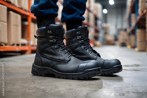 Cropped photo of worker's black safety boots in industrial warehouse background with copy space