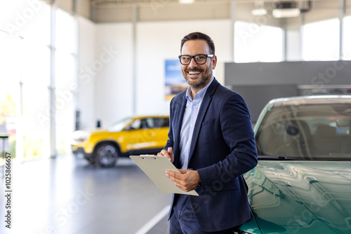 Cropped portrait of a handsome young male car salesman working on the showroom floor. Happy salesperson standing in a car showroom looking at camera.