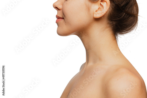 Cropped portrait of young beautiful girl with day makeup isolated over white studio background. Natural beauty concept.