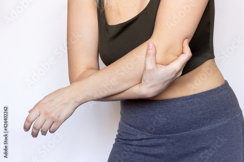 Cropped shot of a young athletic slender woman holding an elbow in her hand. The girl hit her elbow. Arm injuries, elbow pain, neuralgia, dislocation of the joint