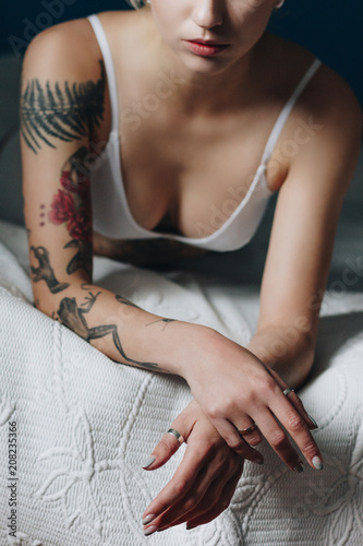 beautiful, person, girl, female, young, adult, people, caucasian, european, bed, hand, pretty, lying, stylish, woman, indoor, sexy, alone, attractive, bedchamber, seductive, fashionable, underclothing, lingerie, bra, tattooed, cropped, tattoo