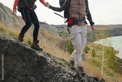 Cropped shot of unrecognizable female tourists hiking around quarry lake doing down the cliff holding hands