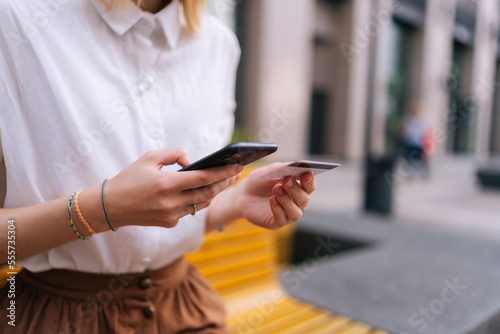 Cropped shot of unrecognizable young woman watching credit card number to insert on smartphone for online shopping sitting on bench on city street. Female paying with credit card walking outdoors.