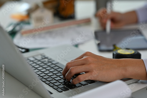 Cropped view architecture's hand working on a blueprint with tools and machine on the table in the office, for engineering, architect, business, safety and technology concept.