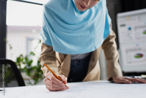 cropped view of blurred muslim engineer drawing blueprint in office