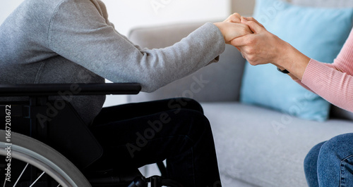 Cropped view of handicapped teenage boy in wheelchair receiving support from his mother or caregiver, holding her hands at home. Impaired adolescent feeling love from his parent indoors