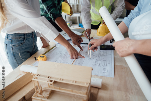Cropped view of team engineers checking new construction project blueprints with engineering tools at work desk in office