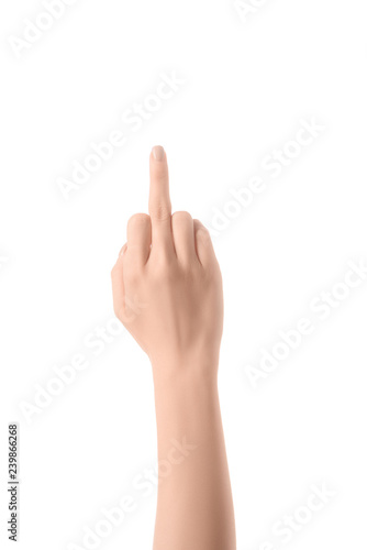 background, person, signs, human, palm, female, adult, people, hand, wrist, symbol, message, woman, communication, finger, arm, showing, limb, rude, partial, cropped, color image, isolated on white, studio shot, body part, middle finger, cut-out