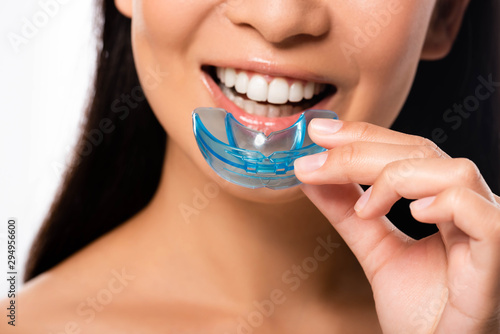 cropped view of woman using mouth guard isolated on white