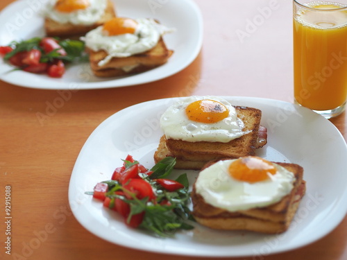 croque monsieur, sandwich, egg, fried, topped, baked, ham, cheese, toast, salad, tomatoes, rocket, yellow, red, green, food, breakfast, morning, white, plate, dish, meal, french, cookery, nourishment, fat, protein, balanced, vitamin, bistro, bread, butter, salted, vegetable, snack, cafes, bar, quick, parisian, hot, emmental, traditional, delicious, nourishing, orange, juice