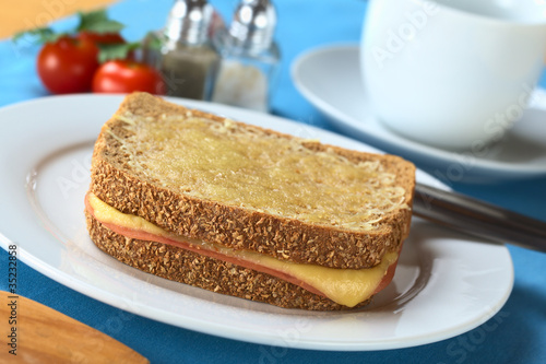 croque monsieur, bread, sandwich, toast, wheaten, baked, warm, cheese, ham, melted, grated, toasted, snack, food, breakfast, french cuisine, slice, piece, brown bread, brown, wheaten, selective focus, nobody, horizontal, color photo, photograph, studio shot