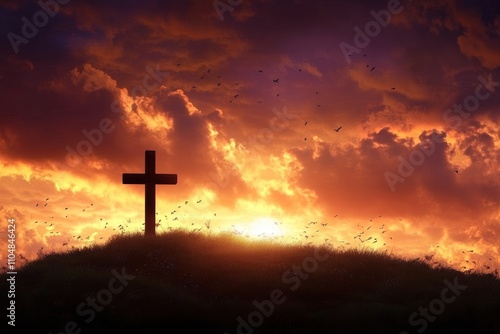 Cross at Sunset on Grassy Hill Christian Symbol of Faith and Reflection