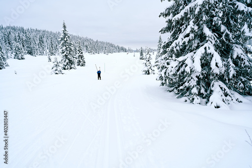 Cross country skiing in the mountains. Family activity.