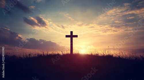 Cross on Hill at Dramatic Sunset Symbolizing Faith and Hope : Generative AI