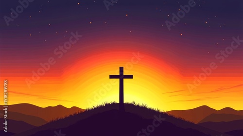 Cross on Hilltop Sunrise - Silhouette of a cross atop a hill against a vibrant sunrise, symbolizing faith, hope, redemption, peace, and spiritual awakening