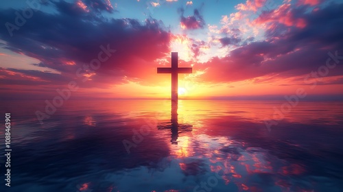 cross, sunset, lake, silhouette, vibrant, sky, glow, serene, meditative, photorealistic, light, clarity, water, calm, spiritual, sacred, tranquil, scene, horizon, ripple, warm, evening
