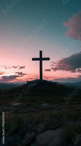 Cross Silhouette on Hilltop at Sunset Easter Concept