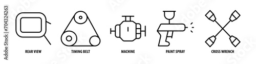 Cross Wrench, Paint Spray, Machine, Timing Belt, Rear View editable stroke outline icons set isolated on white background flat vector illustration.