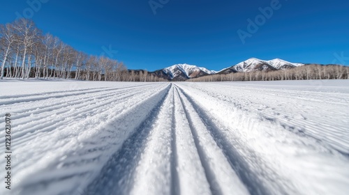 Cross-country ski tracks in snowy field, mountains background, winter landscape, outdoor recreation