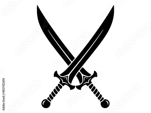 sword, crossed, twin, pair, blade, curved, fight, combat, war, military, battle, ancient, mediaeval, warrior, weapon, sharp, steel, metal, handle, hilt, fantasy, icon, symbol, graphic, vector, illustration, drawing, black, solid, silhouette, monochrome, isolated, danger, security, protection, emblem, logotype, signs, simple, heraldry, classic, object, conflict, power, defense, rivalry, clash