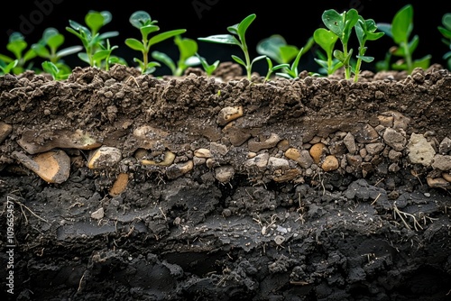Cross-sectional view of soil layers with small green plants growing above. Detailed structure showing organic matter, rocks, and roots beneath the surface.