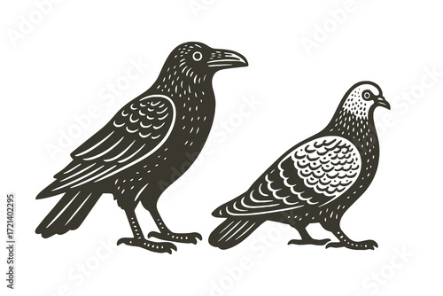 crow, raven, pigeon, dove, bird, engraving, vintage, retro, vignetting, etching, monochrome, isolated, cut-out, vector, icon, print, wildlife, nature, flying, perched, wing, feather, beak, forest, urban, countryside, peace, wild, symbolic, silhouette, outline, drawing, graphic, tattoo, design, emblem, rustic, traditional, predator, sacred, mythology, gothic, contrast, black, white, simple, detail, standing
