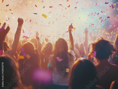 music, festival, concert, crowd, summer, evening, confetti, celebration, energy, dancing, live, atmosphere, enjoyment, fun, night, entertainment, people, joy, community, social, gathering, performance, colourful, event, excitement, revelry, oneness, sound, rythm, light, creativity, art, city, togetherness, happiness, camaraderie, nightlife, engagement, spontaneous, cheer, performer, stage, ambience, relaxation, vibe, urban, light
